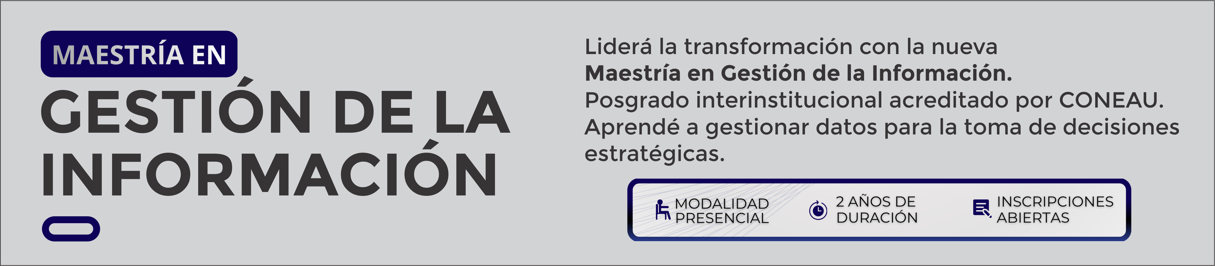 La Facultad de Ingeniería y la Facultad de Ciencias Económicas y Jurídicas de la Universidad Nacional de La Pampa informan que se encuentran abiertas las inscripciones para la primera cohorte de la Maestría en Gestión de la Información, cuyo inicio está previsto para el año 2026.